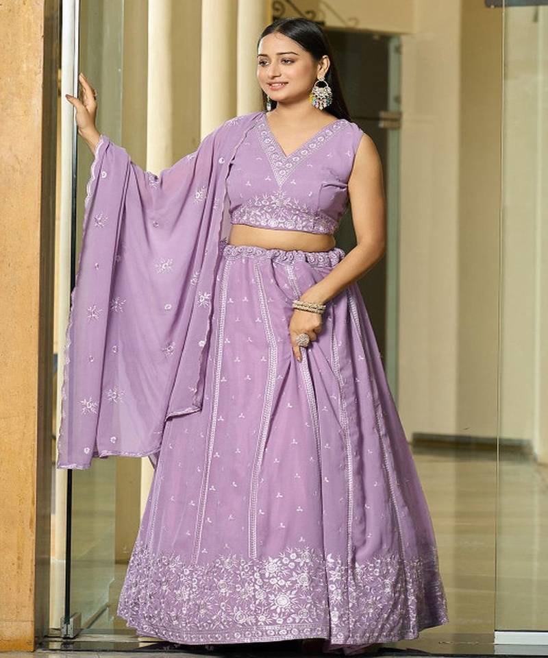 • Style : Circular Lehenga • Fabric : Georgette • Work : Embroidered • Color : Lavender Dupatta Details