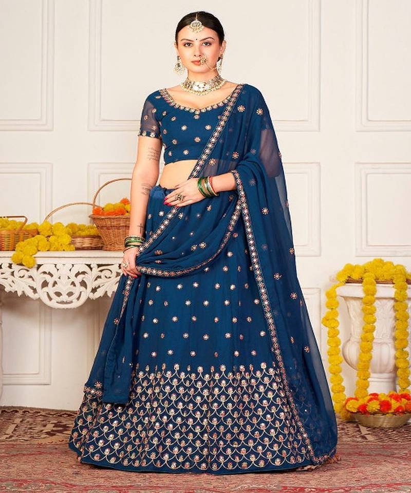 • Style : Circular Lehenga • Fabric : Georgette • Work : Embroidered • Color : Teal Dupatta Details