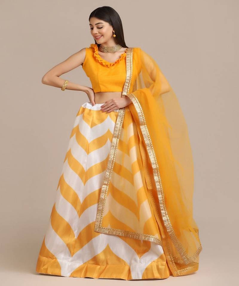 Yellow & White Semi Stitched Lehenga & Unstitched Blouse With Dupatta