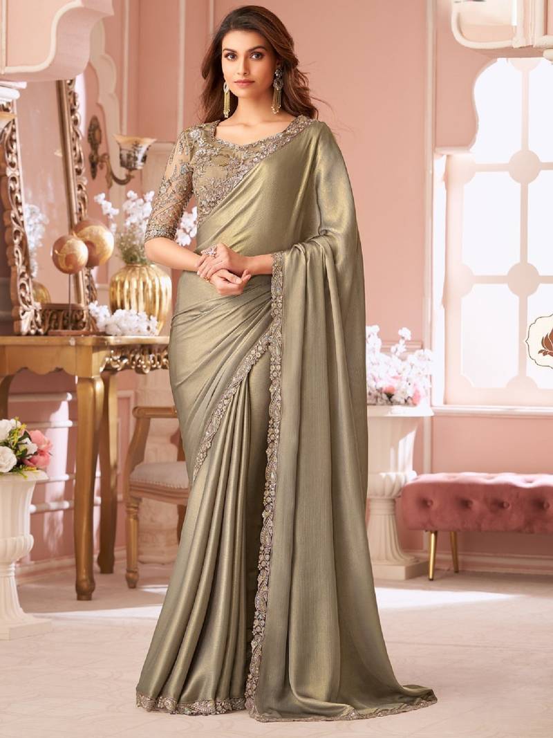 Tan Sequin Shimmer Silk Saree With Work Blouse For Wedding Party