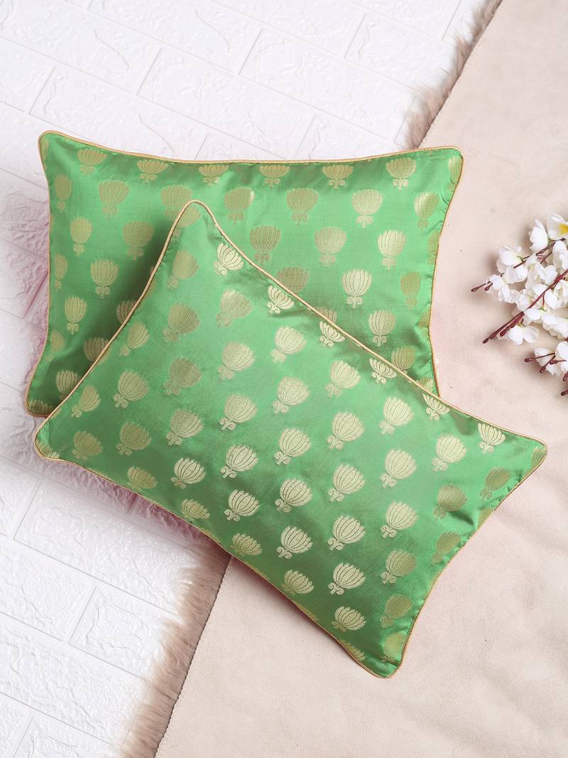 Set Of 2 Pastel Green Lotus Pattern Jacquard Cushion Cover
