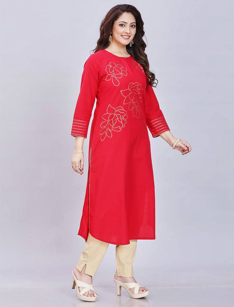 Red Pure Cotton Three Quarter Sleeves Short Kurti