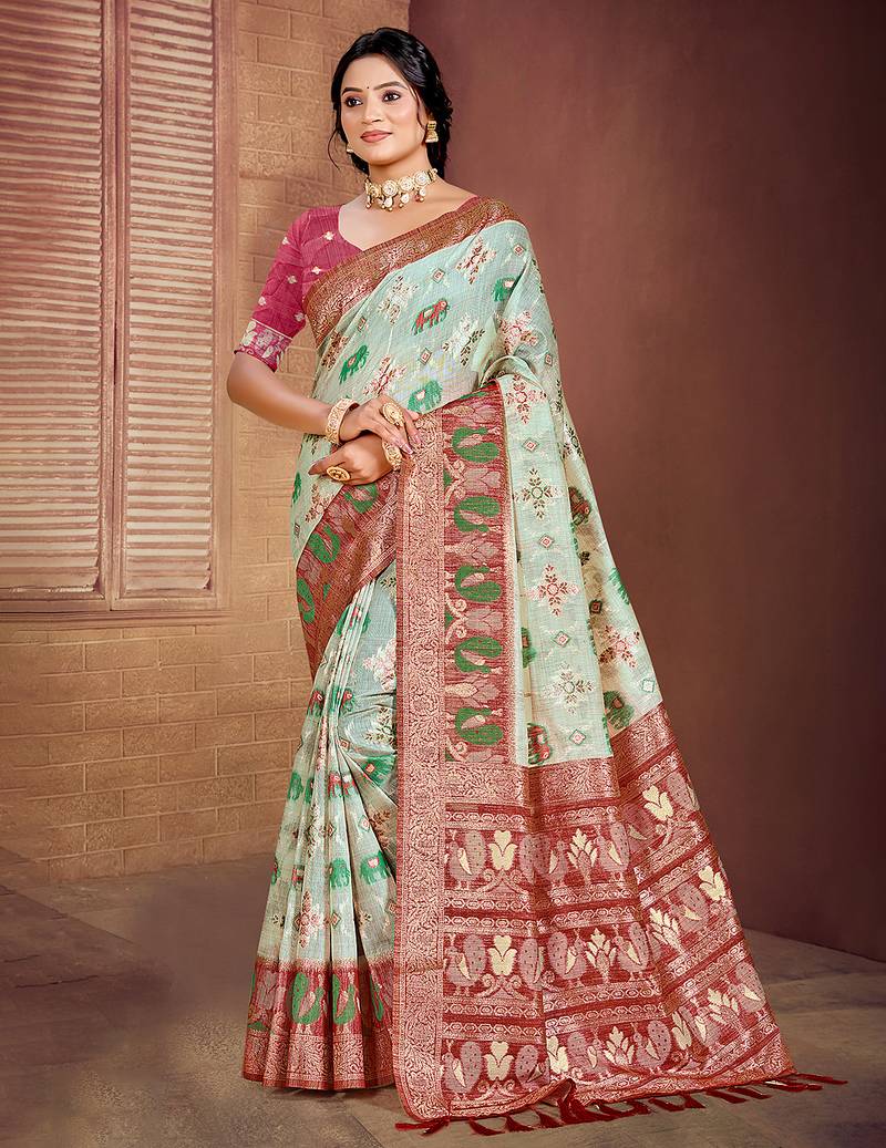 Aqua Blue Cottan Silk Blend With Meena Woven Work Traditional Saree