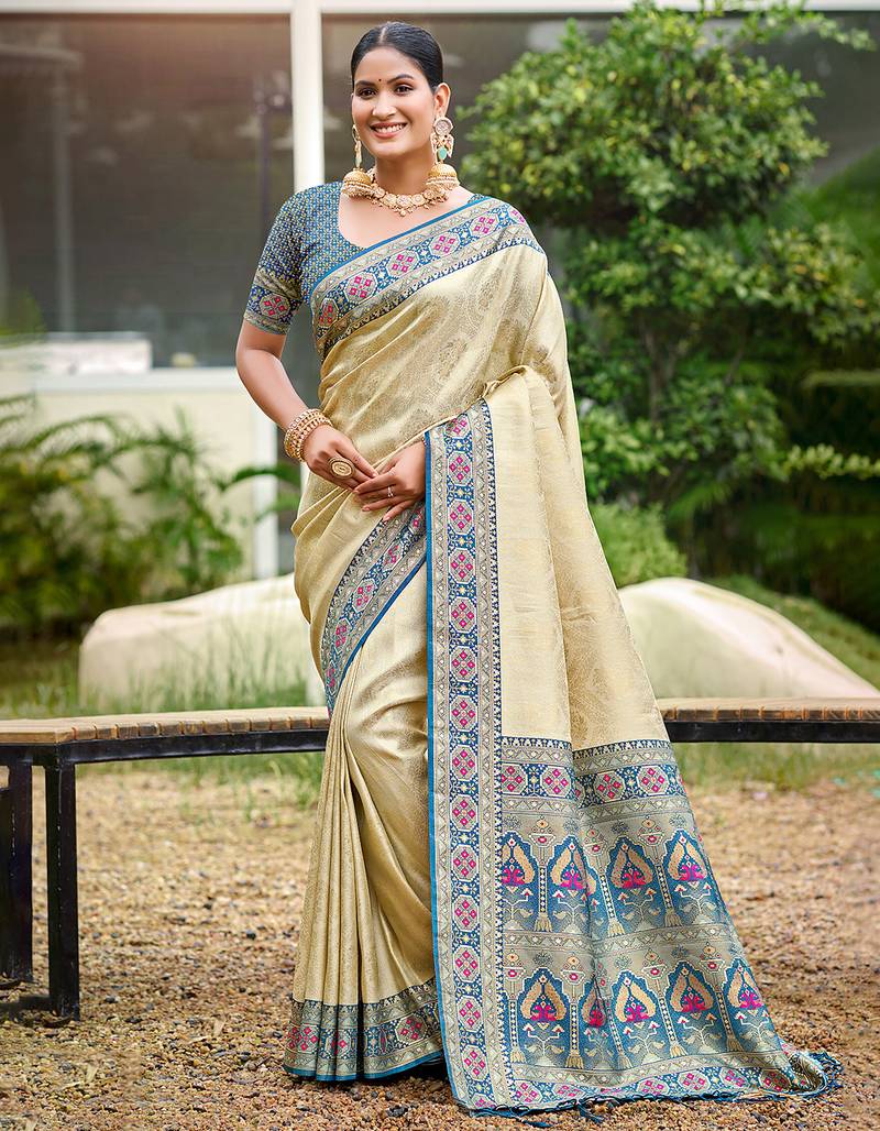Border Blue With Sari Cream Silk Blend Woven Work Traditional Saree
