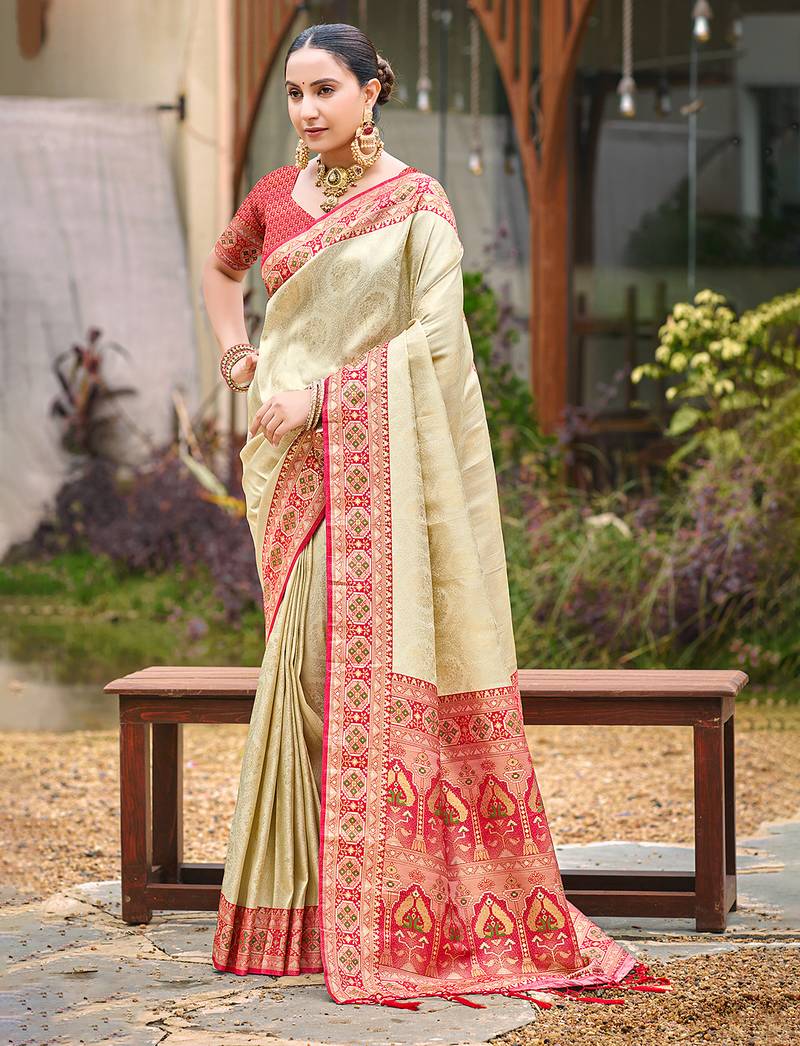 Border Red With Sari Cream Silk Blend Woven Work Traditional Saree