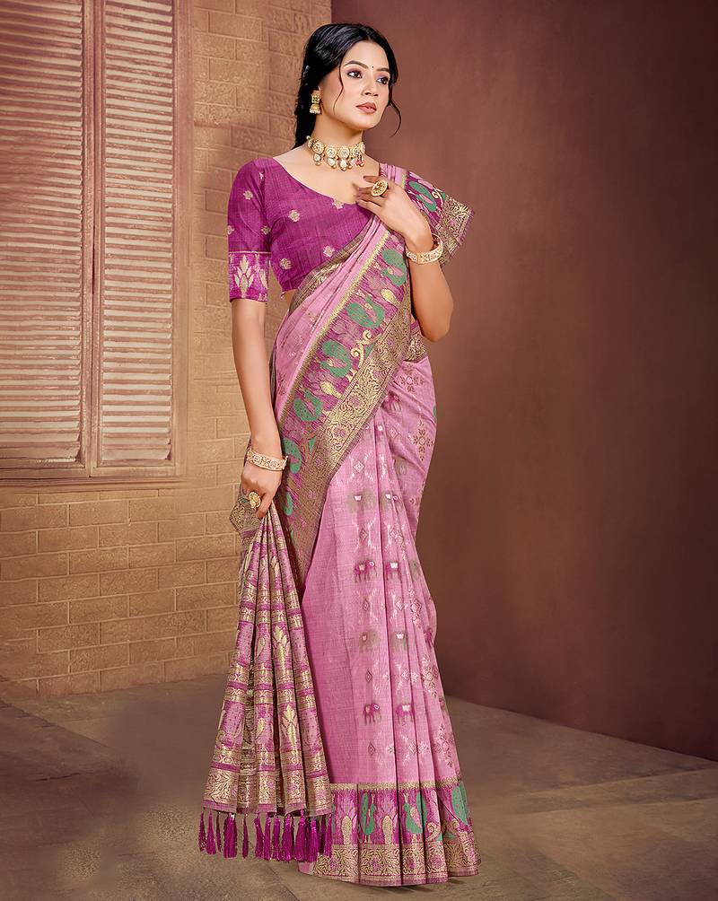 Light Pink Cottan Silk Blend With Meena Woven Work Traditional Saree