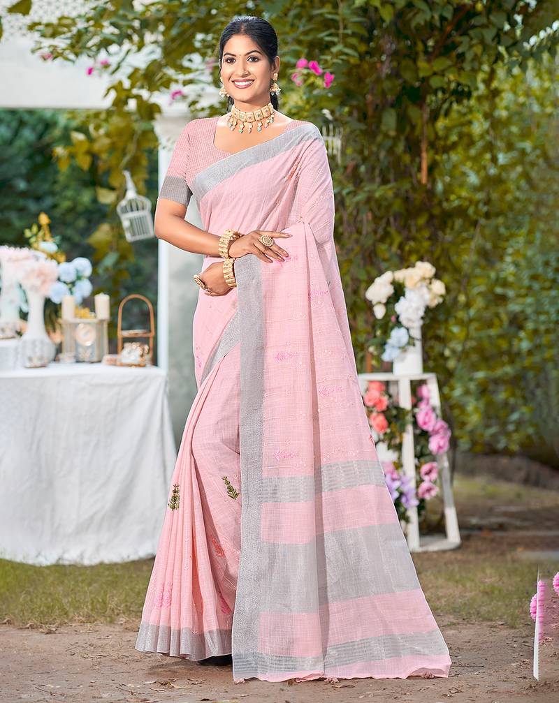 • Border : Designer Border • Fabric Of : Linen • Color : Light Pink • Color : Light Pink Blouse Details