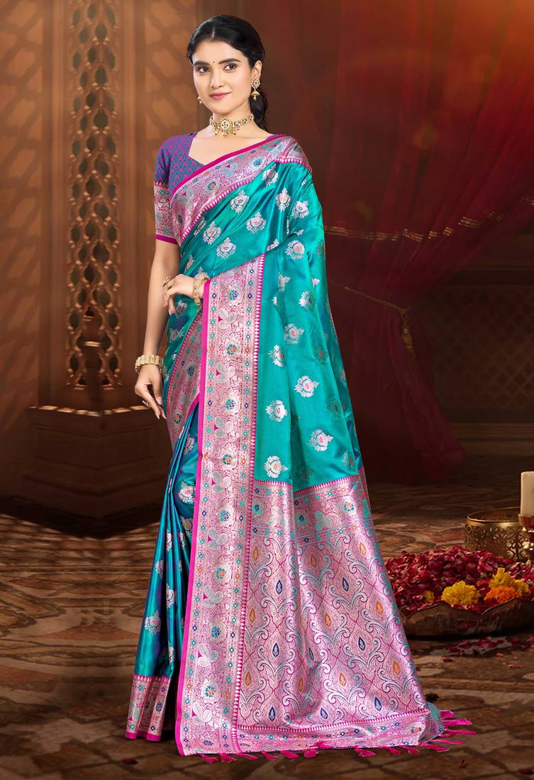 Mehendi Teal Silk Blend Woven Work Traditional Saree
