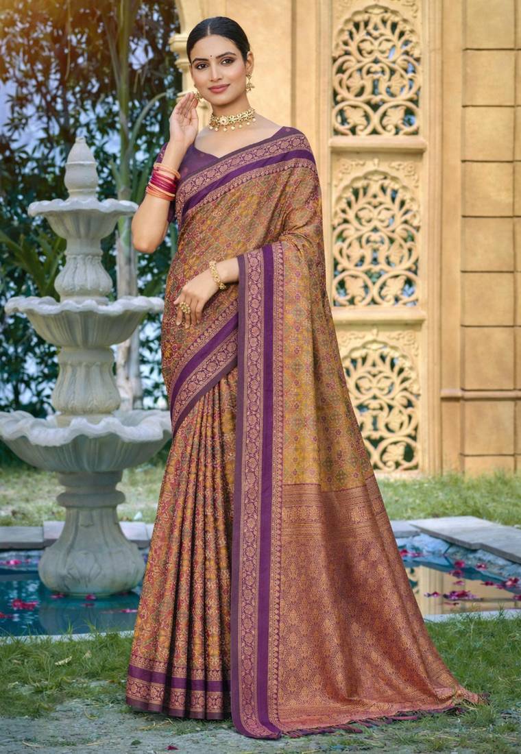 • Saree : Color- Gold / Fabric- Silk Blend • Blouse : Color- Purple / Fabric- Silk Blend Saree Details