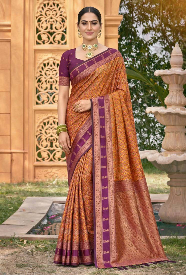 • Saree : Color- Orange / Fabric- Silk Blend • Blouse : Color- Purple / Fabric- Silk Blend Saree Details