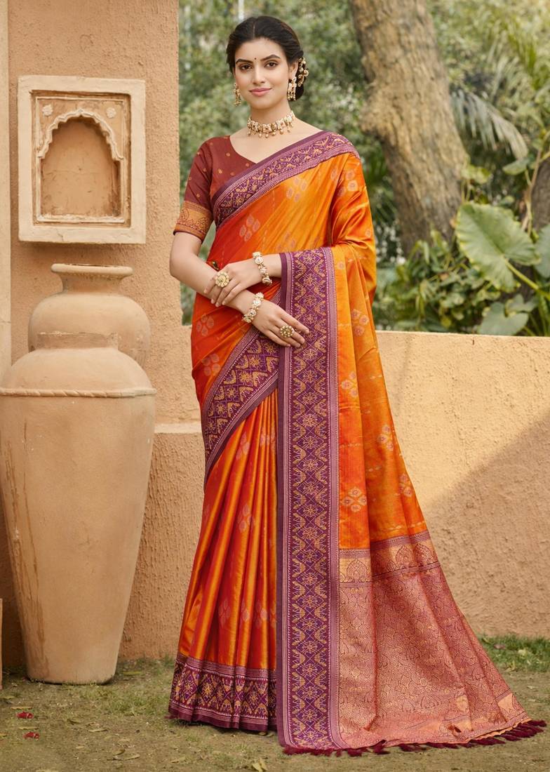 • Saree : Color- Orange / Fabric- Silk Blend • Blouse : Color- Wine / Fabric- Silk Blend Saree Details
