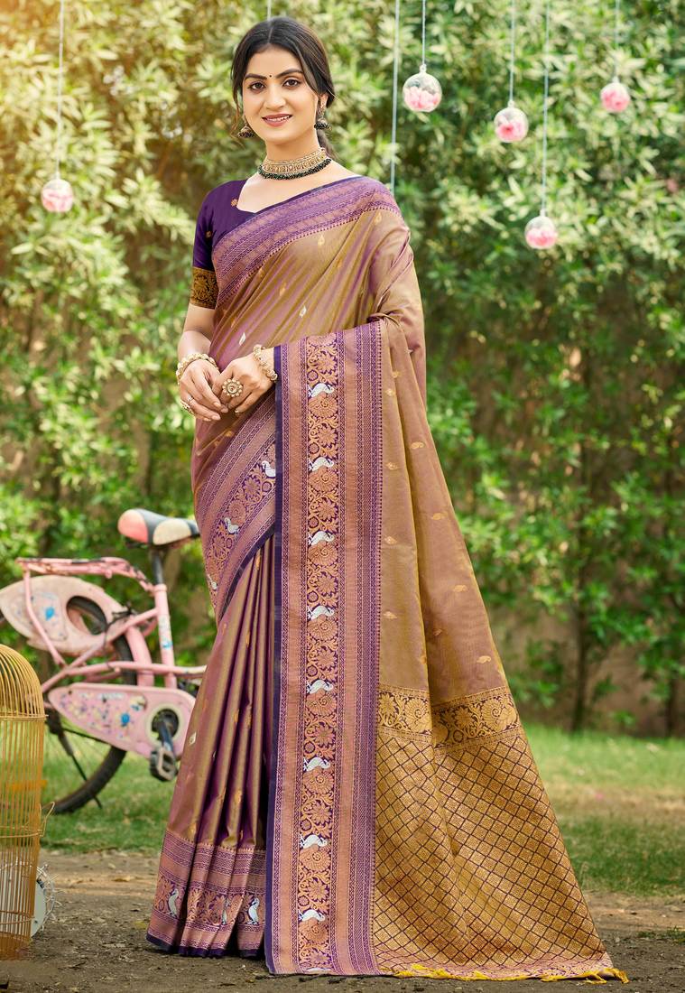 • Saree : Color- Light Brown / Fabric- Silk Blend • Blouse : Color- Purple / Fabric- Silk Blend Saree Details
