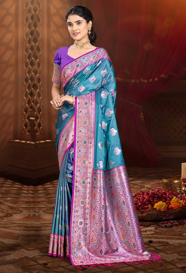 • Saree : Color- Blue / Fabric- Silk Blend • Blouse : Color- Pink / Fabric- Silk Blend Saree Details