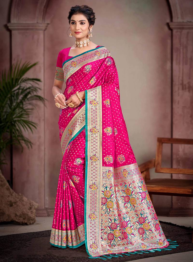 Rani Pink Satin Silk Blend Woven Work Traditional Saree