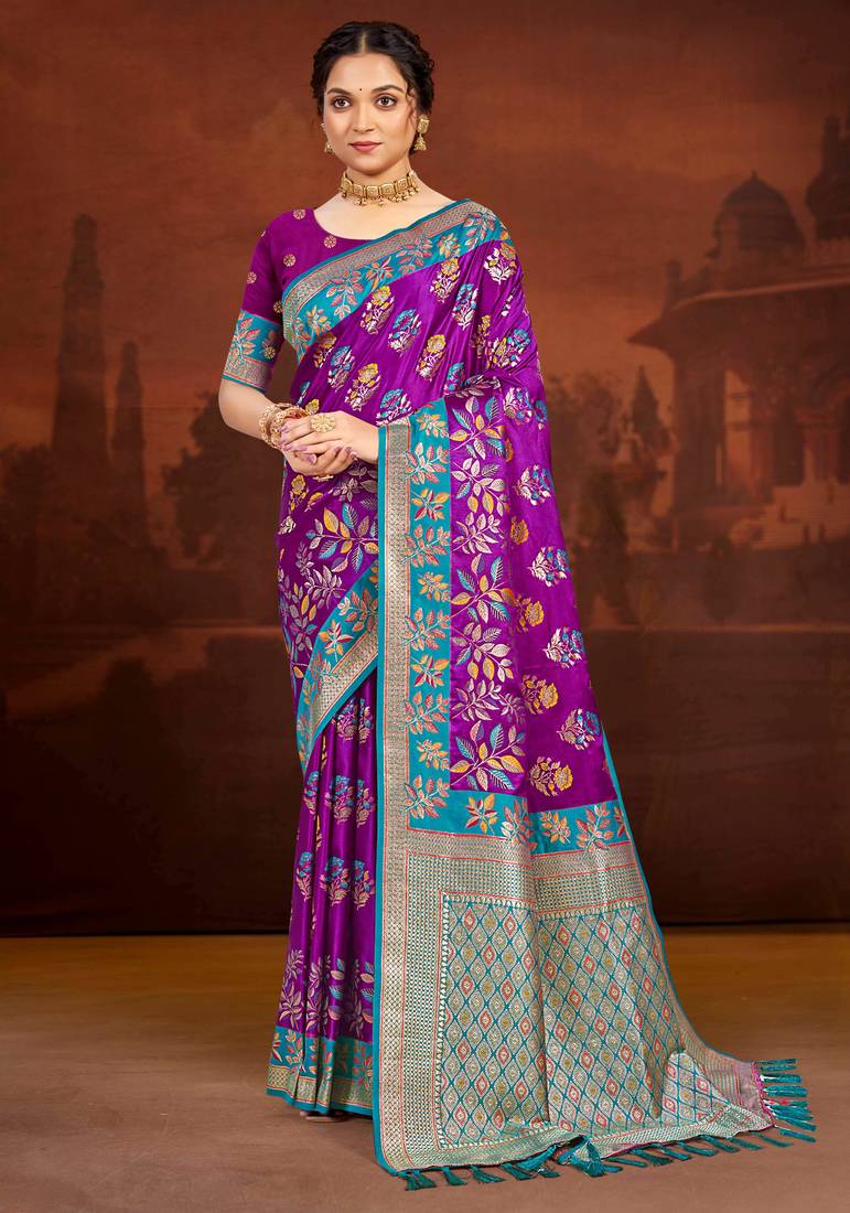 Royal Purple Satin Silk Blend Woven Work Traditional Saree