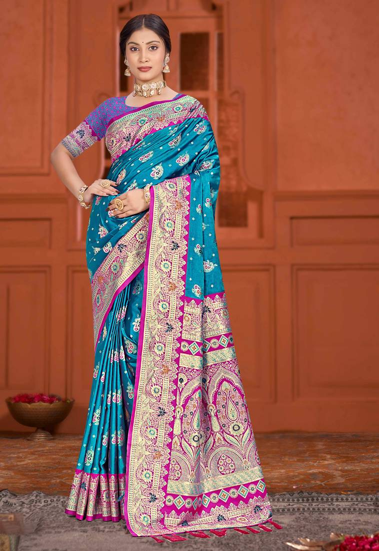 Teal Blue Satin Silk Woven Work Traditional Saree