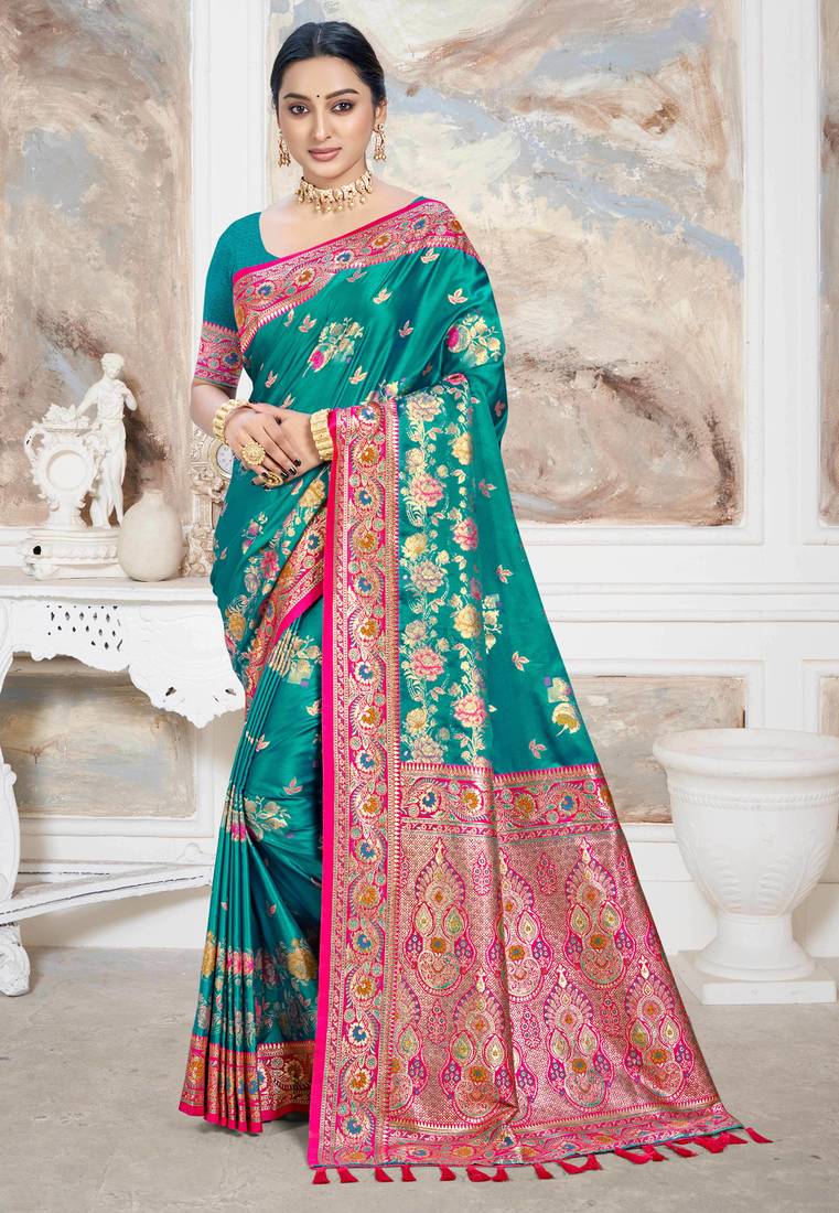 Teal Green Satin Silk Blend Woven Work Traditional Saree