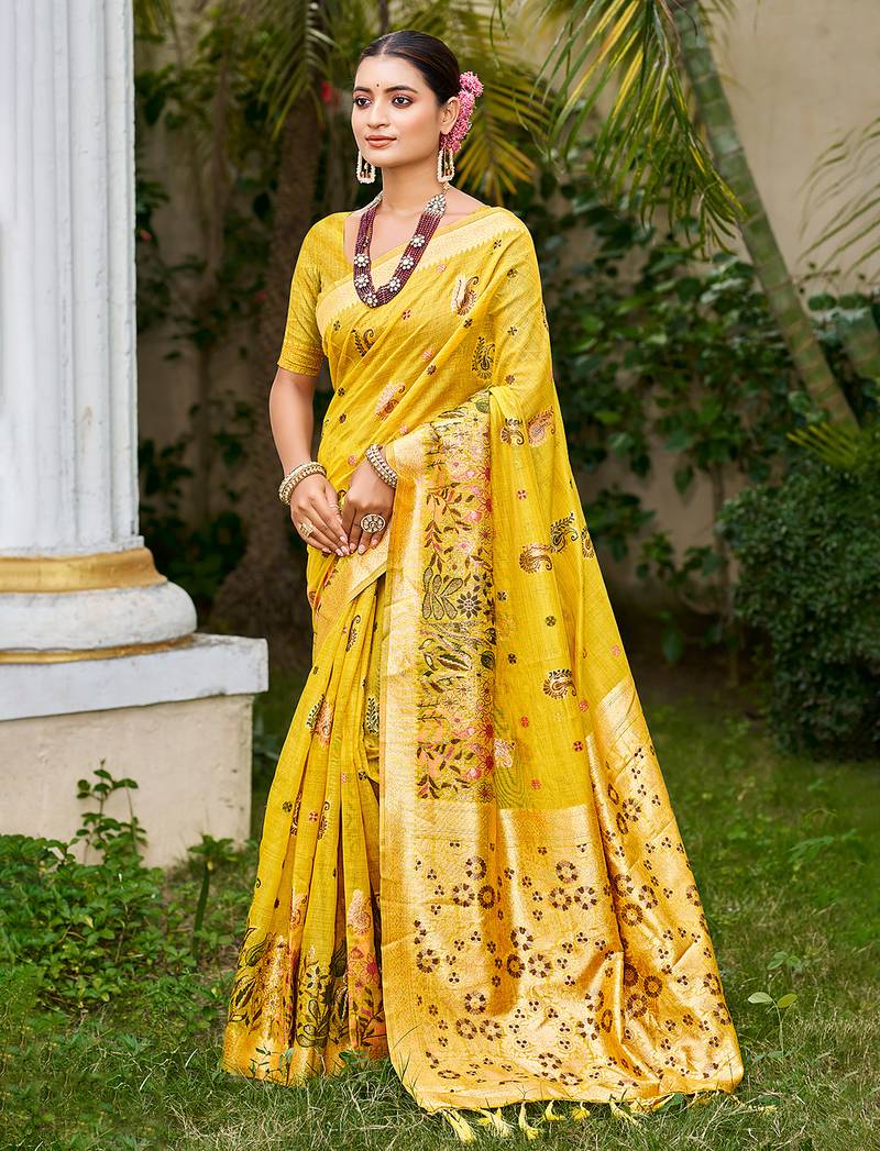 Yellow Cottan Silk Blend With Meena Woven Work Traditional Saree