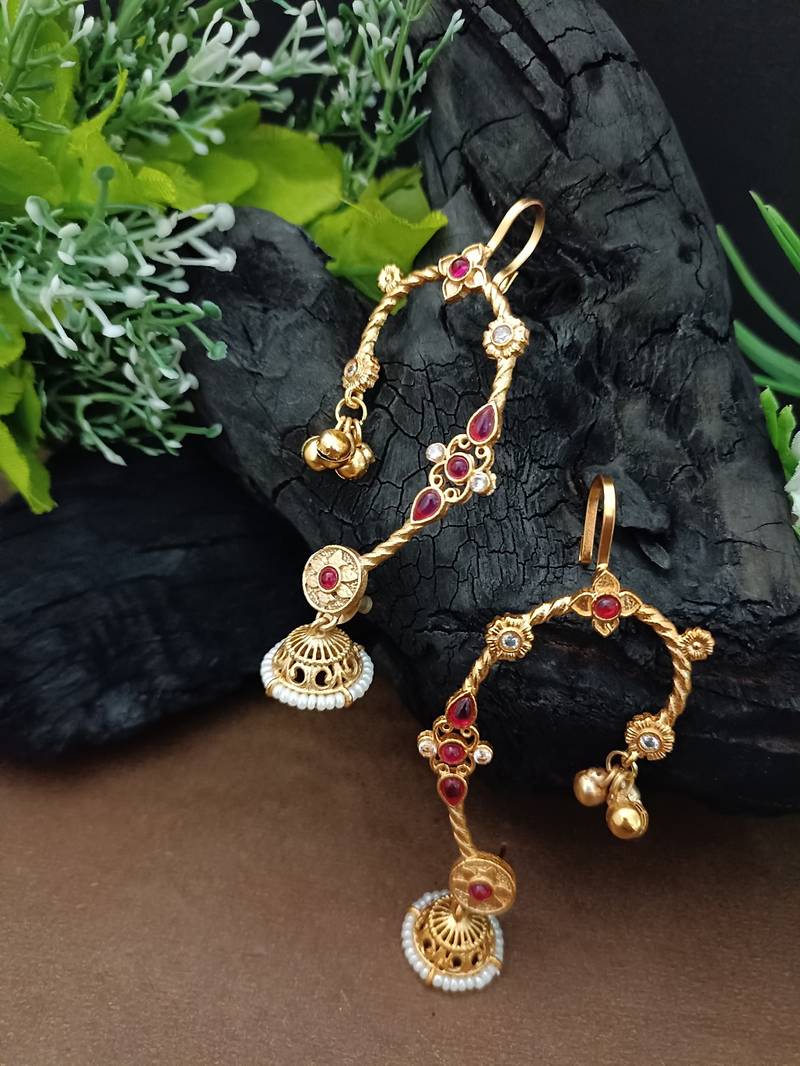 Gold Plated Jhumki Bugadi Earcuff With Red Stones & Pearl Detailing