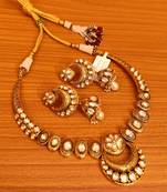 This antique kundan polki necklace set is handcrafted in silver alloy wih fine kunan polki stones and imitation pearls of the finest quality , the necklace set is plated with antique gold rhodium and the work done inside the necklace is very intricate , royal and gives you a real kundan necklace feeling.