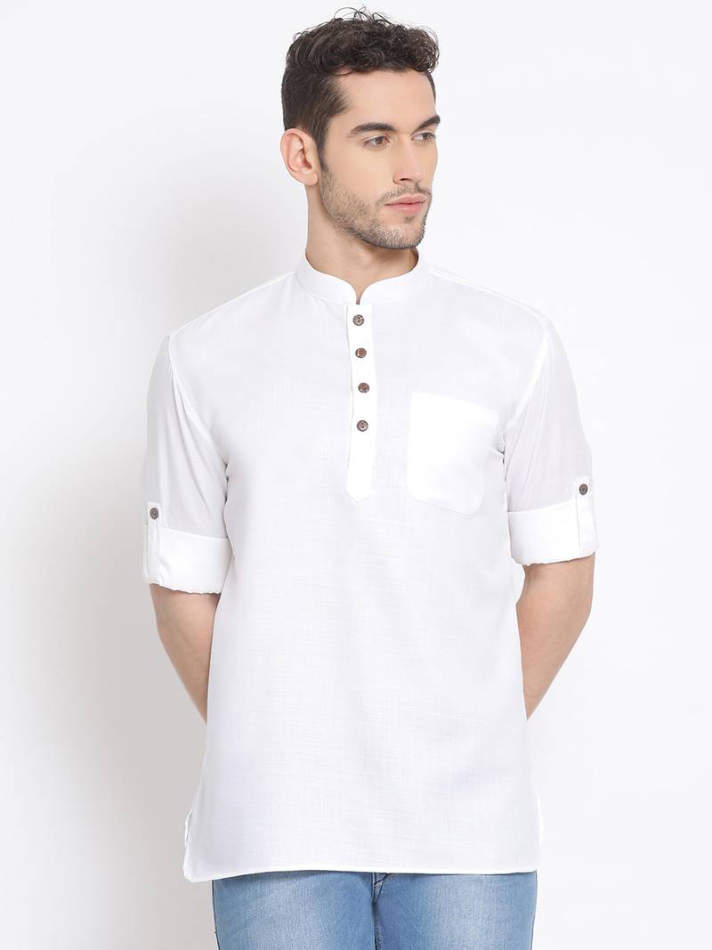 White solid colour cotton fabric straight short kurta has a mandarin collar, long sleeves as well as Roll-up sleeves short lenght, straight hem and side slits.This short kurta will look classy and stylist if wear with jeans,to complete the fashion and style look we can wear a mojari or loafer.