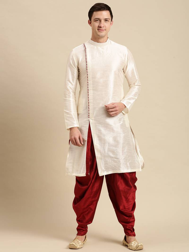 Sanwara Men's Cream Solid Art Silk Ethnic Kurta