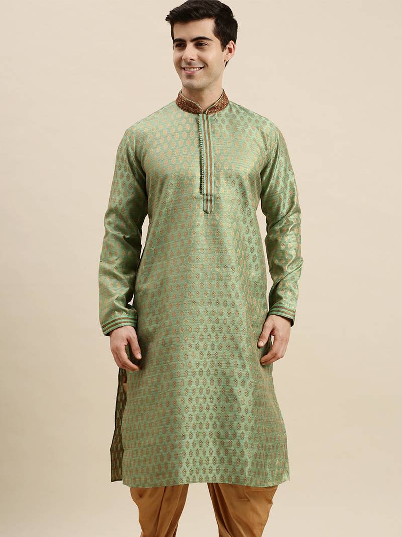 Sanwara Men's Green Woven Long Sleeve Art Silk Elegant Kurta