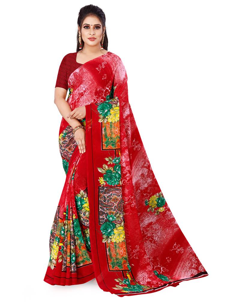 Red Printed Faux Georgette Saree With Blouse