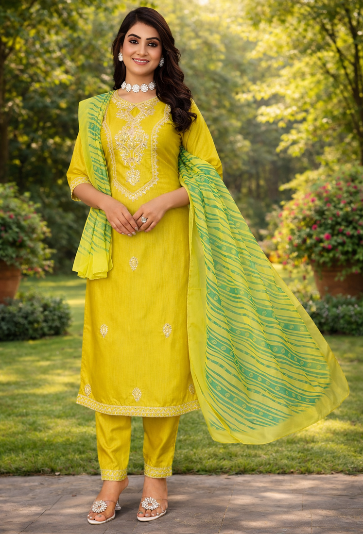 PACKING_1 KURTI :: 1 PANT :: 1DUPATTA• Product Id : 4758687 • Package Details : 1 Kurti / 1 Pant / 1 Dupatta • Type : Party Wear Kurtis • Occasion : Festive • Fabric : Cotton • Work : Embroidered • Type : Dori Embroidery • Look : Fashion • Sleeve : Quarter Sleeve • Neck Style : V Neck • Color : Yellow • Stitching : Stitched General - Color and Texture may have slight variation. This happens because of photography.