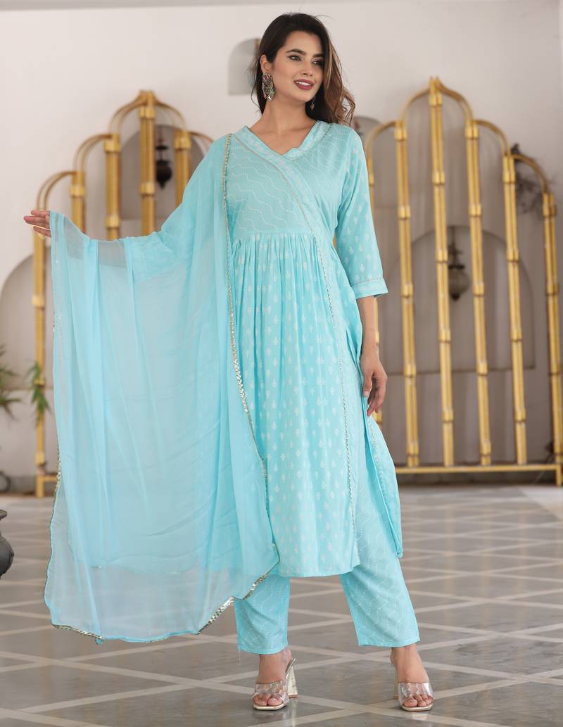 Anarkali Rayon Printed Embroidered Kurta Pant And Dupatta Set For Women And Girls