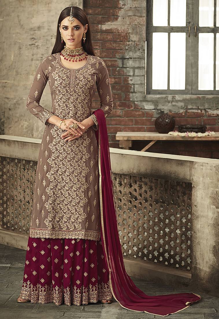 • Product Id : 4704639 • Package Details : 1 Kameez/1 Bottom/1 Dupatta • Type : Sharara Suits • Work : Embroidered • Look : Fashion • Sleeve : Full Sleeve • Stitching : Semi Stitched • Fabric : Georgette • Color : Brown • Min Bustsize Fit : 34.0 • Max Bustsize Fit : 44.0 Stitching [+]