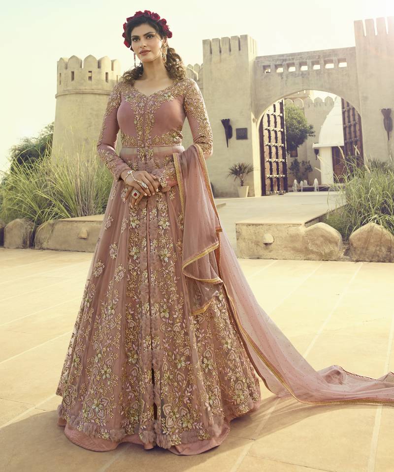 Pink Net Wedding Gown With Embroidery And Crystal Detailing Semi stitched