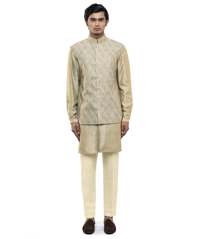 This Green Embroidered Silk Kurta Bandi Set Reflects Regal Elegance And Festive Charm. Crafted From Luxurious Silk Fabric, It Features Intricate Embroidery That Adds A Rich, Refined Touch. Perfect For Weddings And Celebrations, It Offers A Sharp Layered Silhouette, Premium Comfort, And Timeless Ethnic Appeal.