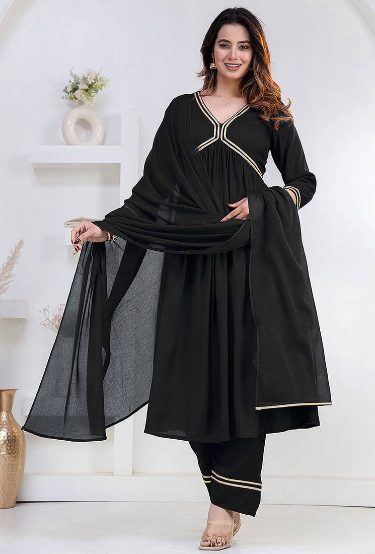 • Fabric : Rayon • Color : Black • Style : Palazzo • Color : Black Dupatta Details