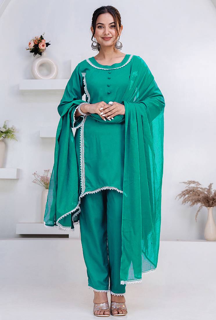 • Product Id : 4715334 • Package Details : 1 Top/1 Bottom/1 Dupatta • Type : Kurta Sets • Type : Thread Work • Look : Designer • Sleeve : Full Sleeve • Neck Style : U Neck • Fabric : Rayon • Color : Green • Work : Lace • Stitching : Stitched Payments [+]
