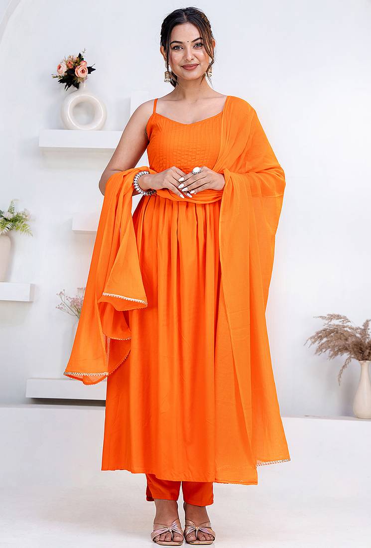 Women Orange Rayon Pintuck Stiched Sleevless Spaghetti Neck Party Wear Flared Kurta Set