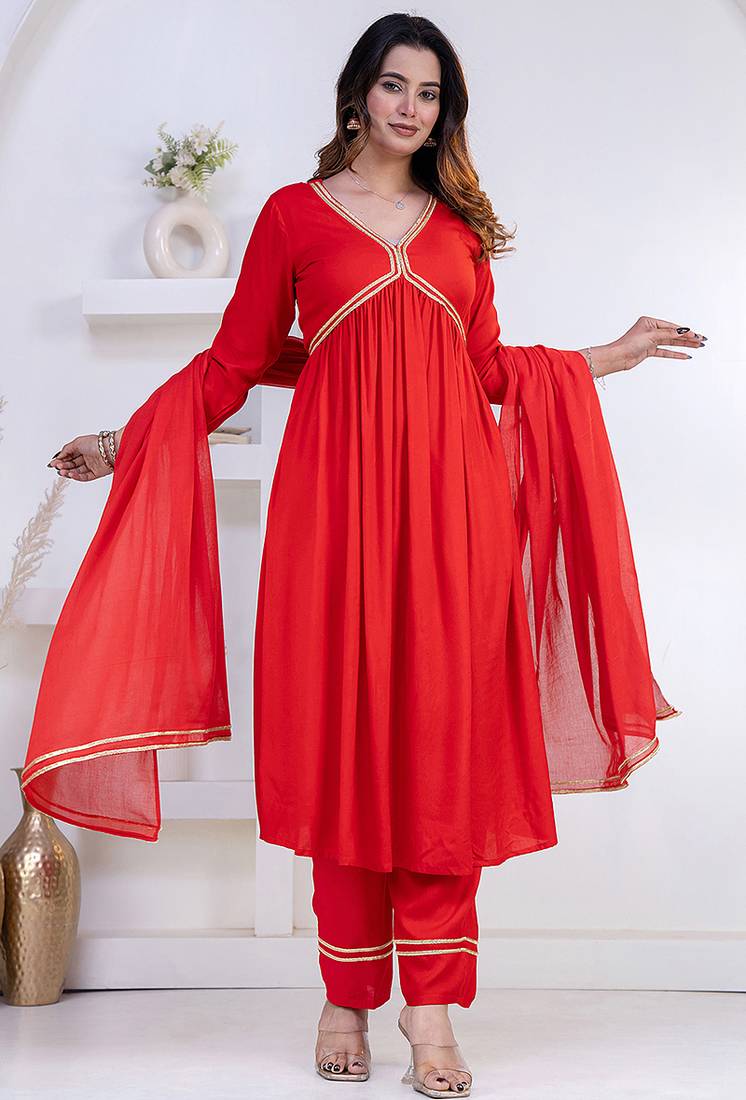 • Fabric : Rayon • Color : Red • Style : Palazzo • Color : Red Dupatta Details