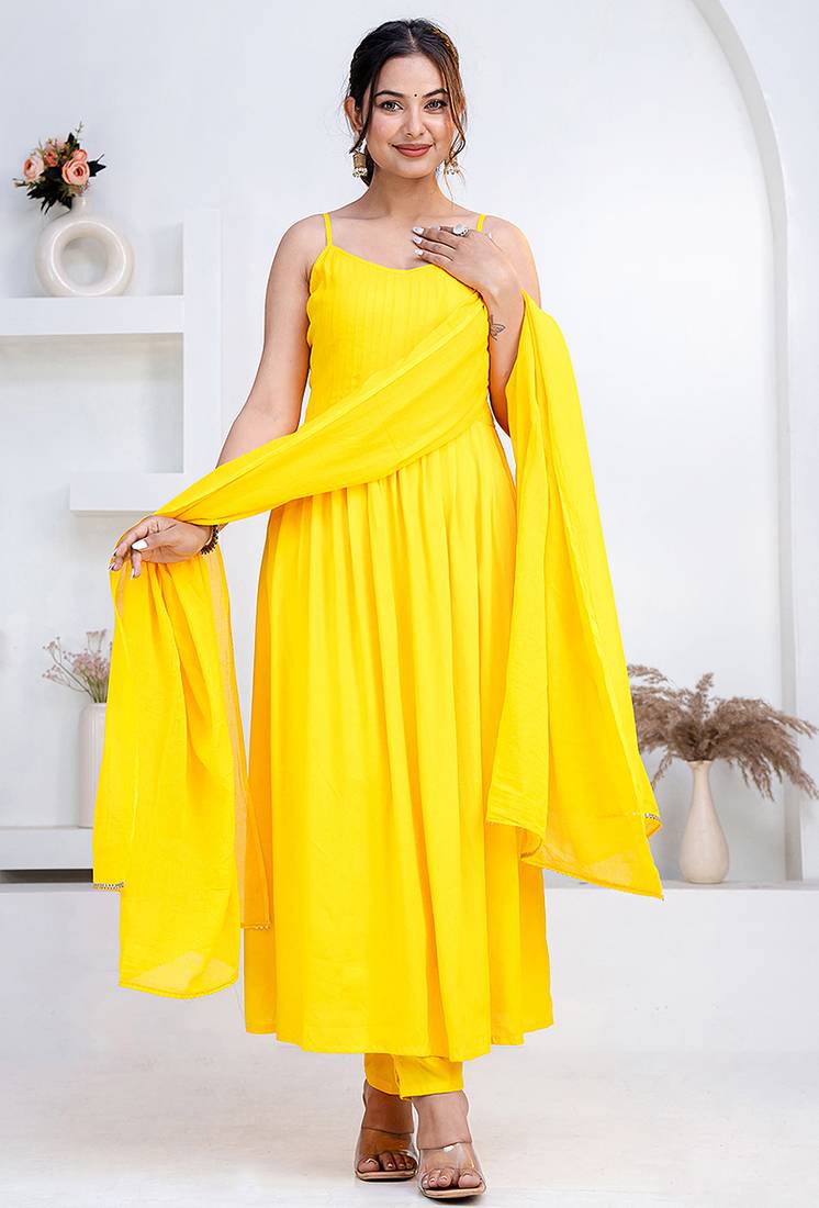 Women Yellow Rayon Pintuck Stiched Sleevless Spaghetti Neck Party Wear Flared Kurta Set