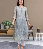 Hand Embroidered Grey Georgette Lucknowi Chikan Kurta With Slip