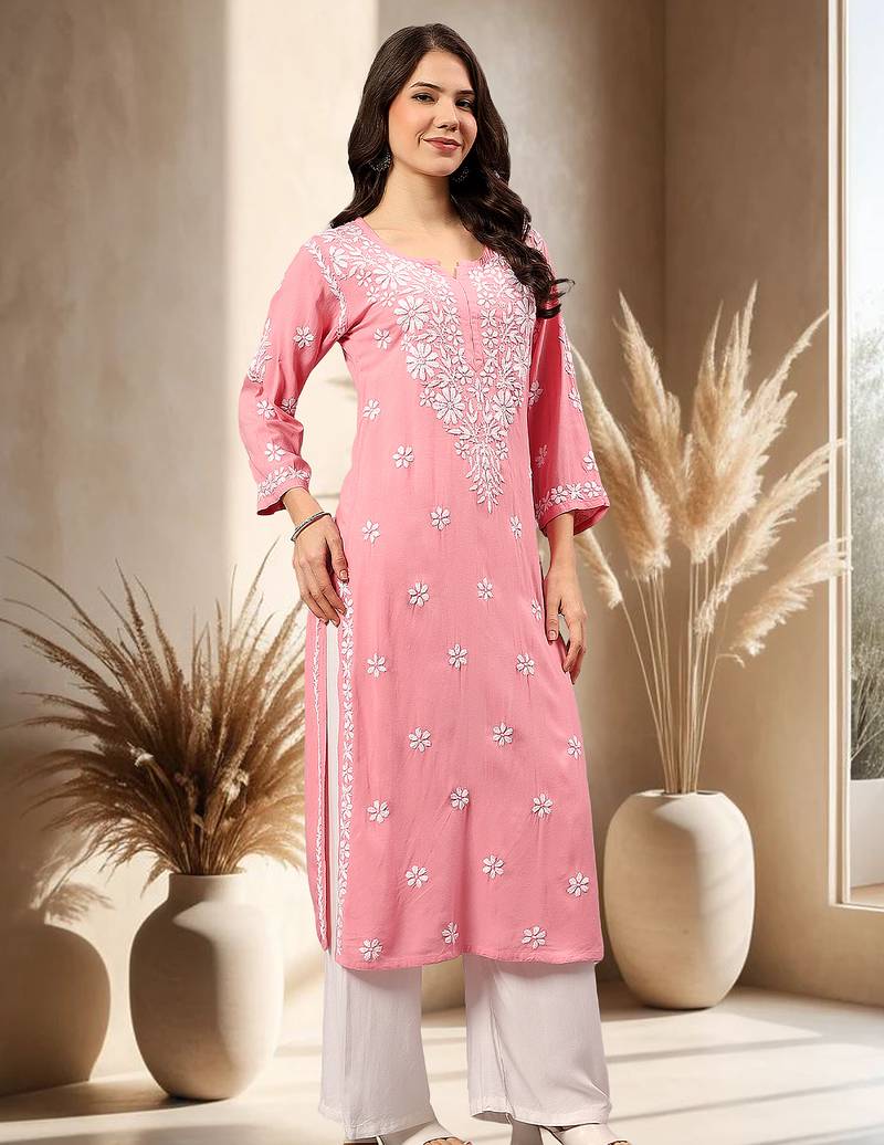 • Product Id : 4705071 • Package Details : 1 Kurta • Type : Cotton Kurtis • Fabric : Cotton • Work : Embroidered • Type : Chikankari • Look : Fashion • Sleeve : Quarter Sleeve • Neck Style : Round Neck • Color : Pink • Stitching : Stitched Stitching [+]