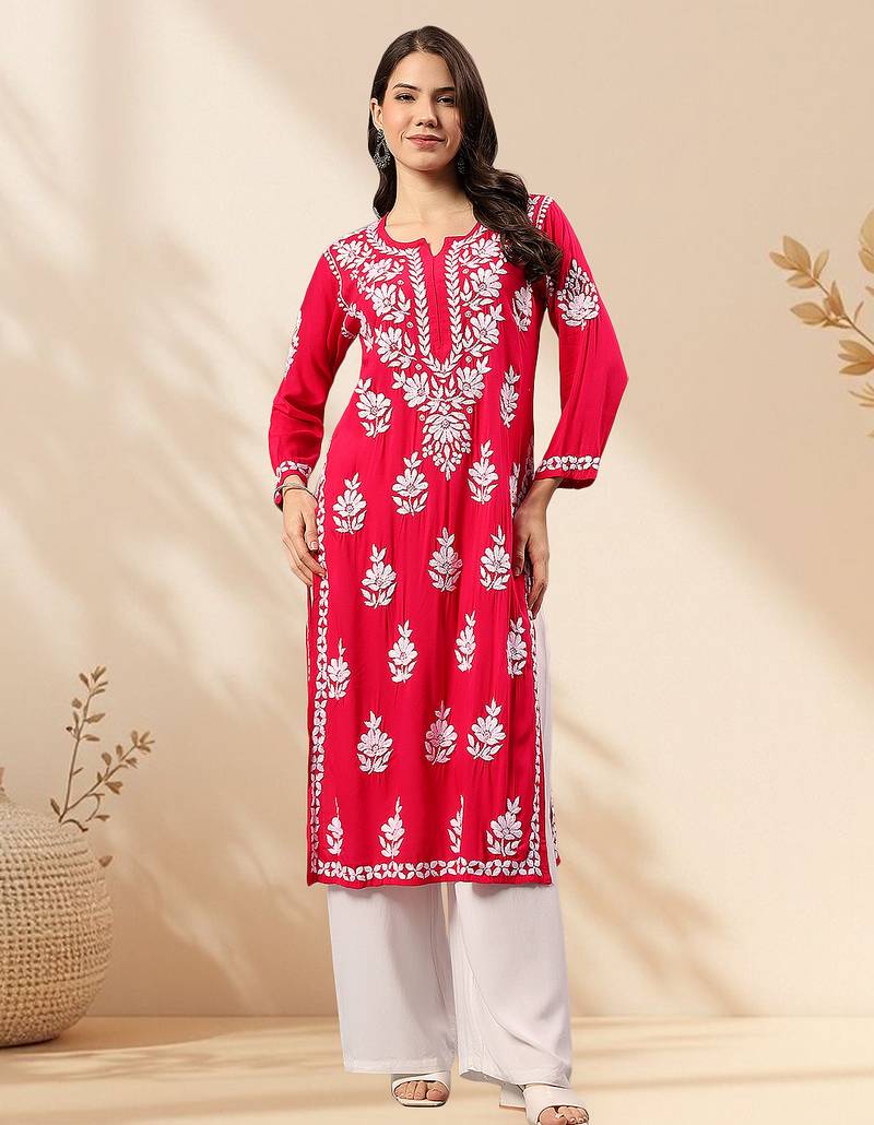Seva Chikan Hand Embroidered Lucknowi Chikankari Magenta Rayon Kurta Scl4470