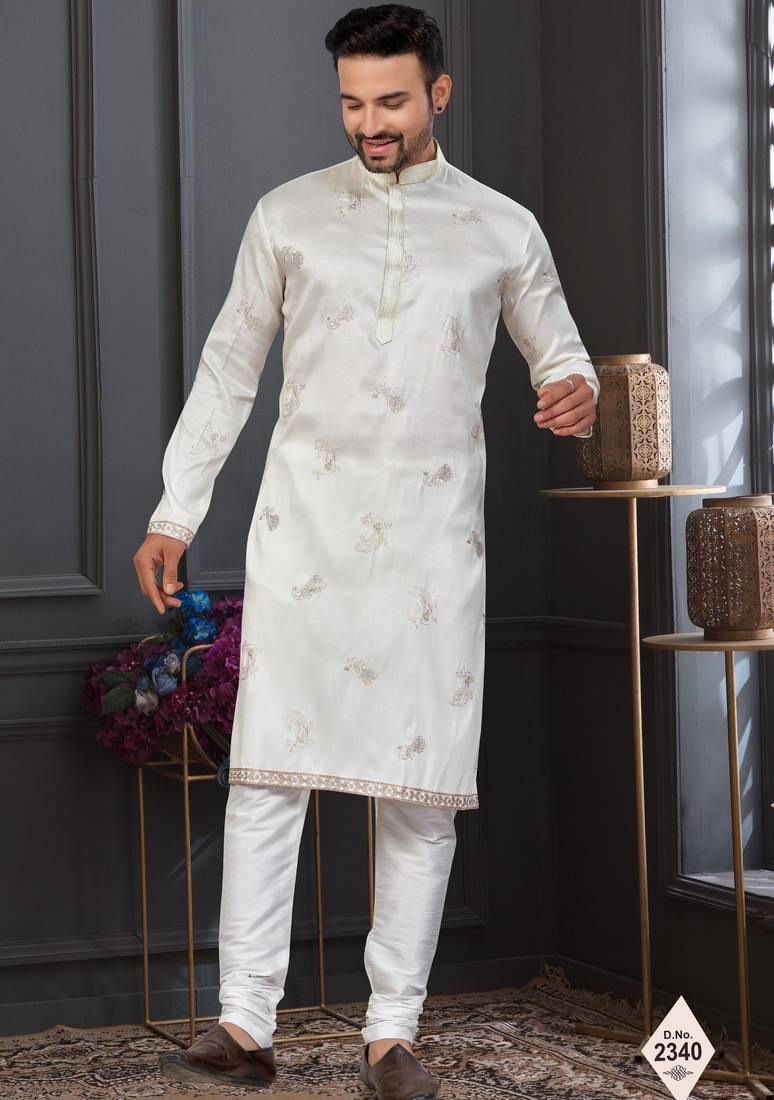 • Product Id : 4703402 • Package Details : 1 Kurta / 1 Pajama • Type : Kurta Pajama • Fabric : Silk • Work : Woven • Look : Traditional • Bottom Style : Churidar • Sleeve : Full Sleeve • Bottom Fabric : Dupion Silk • Bottom Color : Off White • Color : Cream • Top Color : White • Top Fabric : Silk • Stitching : Stitched Payments [+]