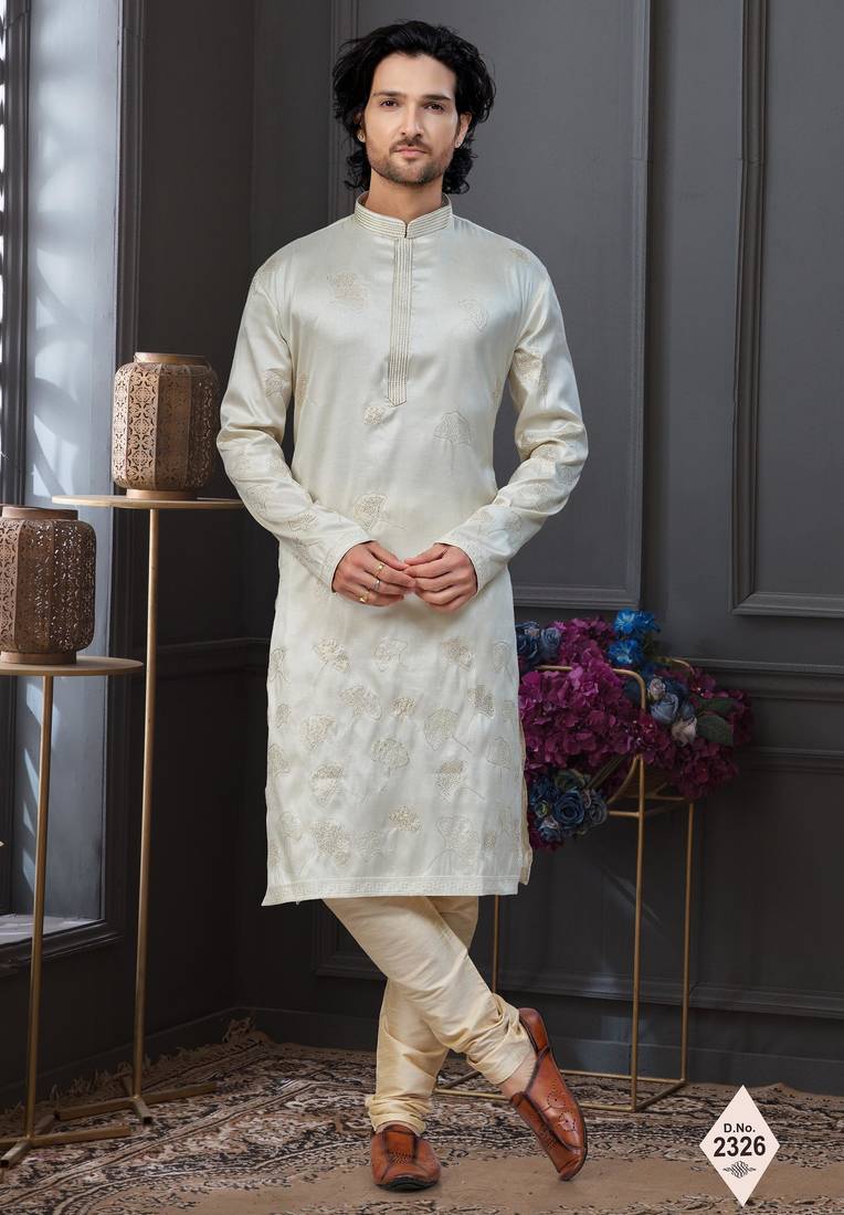 • Product Id : 4703404 • Package Details : 1 Kurta / 1 Pajama • Type : Kurta Pajama • Fabric : Silk • Work : Woven • Look : Traditional • Bottom Style : Churidar • Sleeve : Full Sleeve • Bottom Fabric : Dupion Silk • Color : Cream • Top Color : White • Top Fabric : Silk • Bottom Color : Fawn • Stitching : Stitched Payments [+]