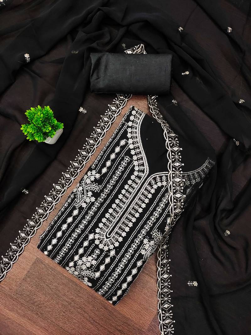 Black Embroidered Georgette Semi Stitched Churidar Dress Materials