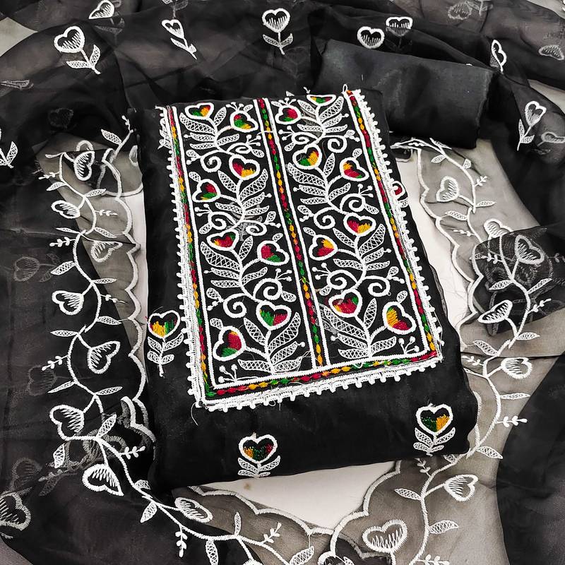 Black Embroidered Organza Semi Stitched Churidar Dress Materials