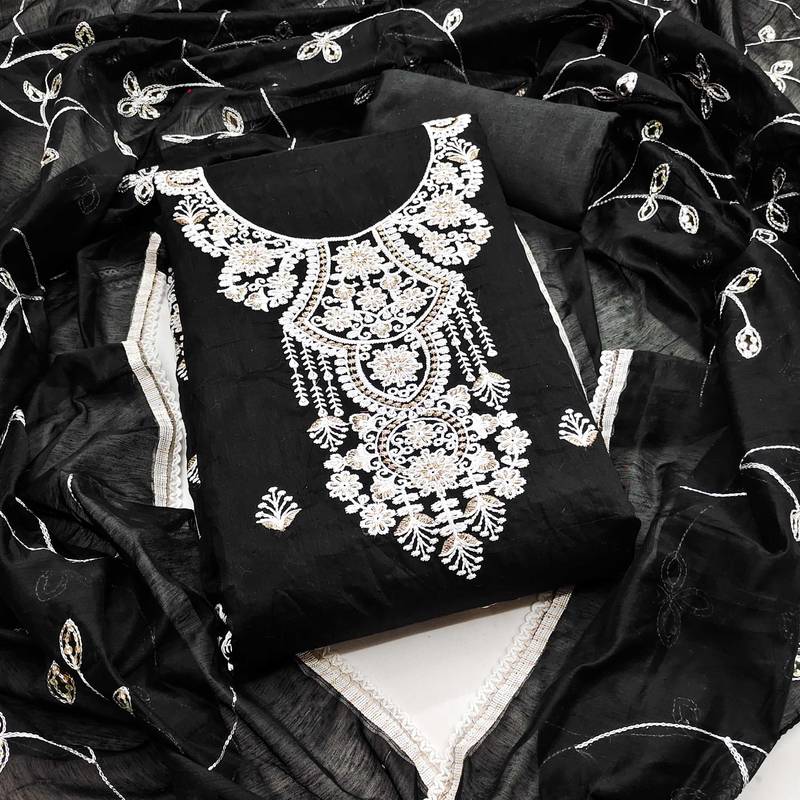 If you find the product for less we'll match it! Know MoreCharming Heavy Thread Sequence Zari Embrodiery And Fancy Border With Embroidered Dupatta Work Straight Style 1.90 Mtr Unstitched Dress Material Top Of Black Colour Chanderi Cotton Fabric With 2 Mtr Santoon As Lining Inner Fabric Also Including 3.80 Mtr Unstiched Bottom Material Of Black Colour Santoon Fabric With 2.10 Mtr Dupatta Of Black Colour Chanderi Cotton Fabric By Shadow & Saining Brand