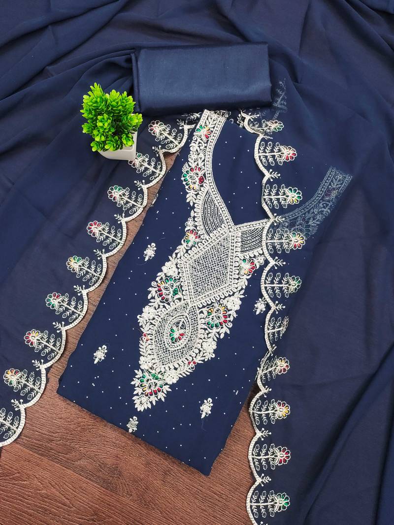 Blue Embroidered Georgette Semi Stitched Churidar Dress Materials