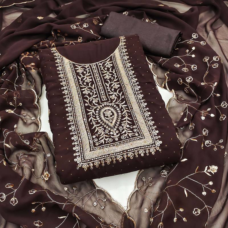 Brown Embroidered Georgette Semi Stitched Churidar Dress Materials
