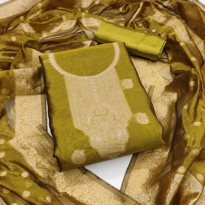 Green Woven Shimmer Semi Stitched Churidar Dress Materials