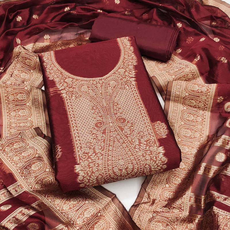 If you find the product for less we'll match it! Know MoreStylish Designer Weaving With Fancy Dupatta Straight Style 1.80 Mtr Unstitched Dress Material Top Of Maroon Colour Simmer Silk Fabric With 2 Mtr Santoon As Lining Inner Fabric Also Including 3.60 Mtr Unstiched Bottom Material Of Maroon Colour Santoon Fabric With 2.10 Mtr Dupatta Of Maroon Colour Simmer Silk Fabric By Shadow & Saining Brand